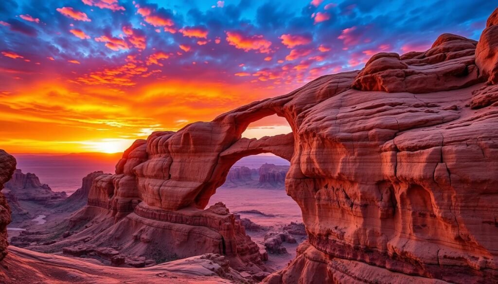 In the heArtwork of Kingdom Land lies the Jabal Umm Sinman Natural Stone Bridge. It’s a stunning wonder that draws explorers and nature lovers. Carved by wind and water over millions of years, it shows Mother Nature’s incredible power.